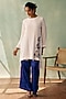 Featuring an ivory high-low kurta in georgette base with sequins embroidery. It is paired with crushed satin pants. Accentuate it with block heels and statement earrings for festive ceremonies.