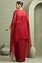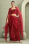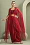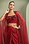 Featuring a red cape in organza base. It is paired with a foil milano bustier having sequins, beads, cutdana and pipe abstract embellishment, including a shimmering draped skirt. Accentuate it with sculpted silver earrings, a sleek statement cuff, and strappy heels for a stylish ensemble, ideal for destination weddings, sundowner parties, or glamorous resort celebrations.