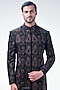 Featuring a navy blue indo-western jacket in velvet and cupro base with cutdana hand and machine embroidery. It is paired with straight trousers. This attire would be an excellent fit for a reception or sangeet ceremony.