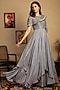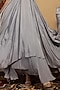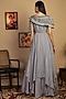 Featuring a grey gown in habutai silk base with beads, zari, pearls, and sequins embroidery, including an attached viscose crepe half-cape.