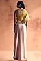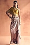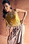 Featuring a mustard yellow bustier in satin base with embellishment. It is paired with a muted grey draped skirt. It is paired with a cape. Accentuate it with hoop earrings and block heels for an indowestern look or festive ceremonies.