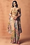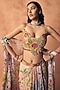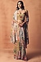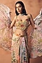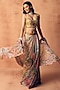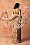 Featuring a pale blue cape-style drape in georgette and organza base with floral motif details. It is paired with a printed blouse and a skirt. Accentuate it with hoop earrings and block heels for an indowestern look or festive ceremonies.