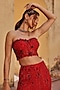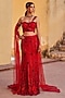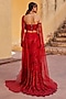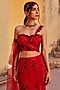 Featuring a red fish-cut skirt in chantilly base with 3D floral work, crystal and bead embroidery. It is paired with an embroidered structured blouse, drape and detachable hand embroidered sleeves. Accentuate it with dangler earrings and heels for a festive occasion or sangeet ceremony.