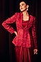 Featuring a red peplum-cut jacket in silk and satin base with sculpted lapels. It is paired with a fluid satin draped skirt and a bustier. Accentuate it with statement jewellery, a structured clutch, and sleek heels for a perfect fusion of modern tailoring and timeless glamour, ideal for cocktail evenings and high-fashion festive soirees.