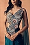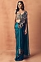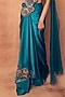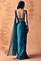 Featuring a teal blue skirt saree in satin base with thread work. It is paired with a crepe embroidered blouse, including a crepe and organza drape. Accentuate it with hoop earrings and block heels for engagement or sangeet ceremonies.