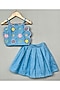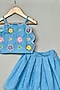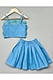 Featuring a blue skirt for girls in denim base. It is paired with an embroidered top. Style it with cute hair accessories and sandals for a festive occasion.