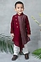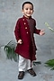 Featuring a maroon asymmetric kurta for boys in dola silk and chanderi base with hand block print. It is paired with white pants having elasticated waistband. Team it up with mojaris and watch for a festive occasion or sangeet ceremony.