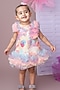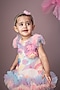 Featuring a multi-colored A-line dress for girls in cotton linen and net base with floral print, frilled hemline and handmade floral detailing. Elevate your look for a birthday party or a casual-day out by accessorizing this designer dress with sandals and cute hair accessories. It's the perfect way to add a touch of glamour and elegance to your ensemble.