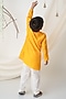 Featuring a yellow kurta for boys in muslin base with an attached bandhani jacket. It is paired with pyjama pants. Team it up with mojaris and watch for a festive occasion or haldi ceremony.