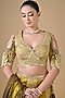 Featuring a gold lehenga in imported tissue base with zari, aari, mirror, cutdana, sequins and beads hand embroidery. It is paired with an embroidered blouse and a dupatta. Accentuate it with zircon jewellery and block heels for a sangeet or wedding ceremony.