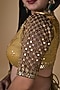 Featuring a golden lehenga in imported tissue base. It is paired with a blouse having mirror and zari hand embroidery, including a dupatta and a belt. Accentuate it with polki jewellery and block heels for a sangeet or wedding ceremony.