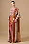 Featuring a rose gold pre-draped saree in imported tissue base with pearls and nakshi hand embroidery. It is paired with a crop top and a cape. Accentuate it with silver jewellery and block heels for a wedding or sangeet ceremony.