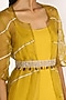 Featuring a yellow jacket in georgette base with gota, kasab and resham embroidery. It is paired with matching gharara pants, an organza jacket, and a grey embroidered belt.