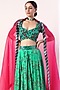 Featuring a green lehenga in crepe base with floral motif print. It is paired with a matching blouse having sequins embellishments and a fuchsia hand embroidered dupatta in silk organza base.