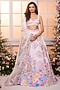 Featuring a white lehenga in satin base with floral print, beads and crystal hand embroidery. It is paired with a blouse and a dupatta. Accentuate it with zircon jewellery and heels for a wedding or sangeet ceremony.