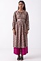 Featuring a brown gathered kurta in pure silk base with adjustable drawstring and handmade tassels. It is paired with contrasting magenta pants.
