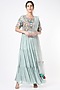 Featuring a turquoise anarkali in silk, chinon, and net base with resham embroidery. It is paired with matching pants and a dupatta.