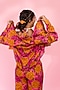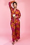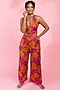 Featuring a pink crop top in a viscose crepe base. It is paired with a matching shirt and lounge pants.