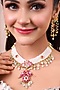 Featuring a two tone finish necklace studded with pachi kundan, pearl beads, ruby and aqua stones, set in brass. It is paired with a matching pair of earrings. Ideal for festive occasions or wedding ceremony.
