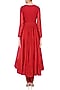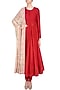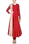 This set features a red neatly trimmed kalidaar kurta in chanderi base. It has a round neckline and potli button closure detailing on the front placket. It is paired with red silk churidaar pants along with beige pearl embroidered dupatta in tissue chanderi base.