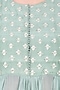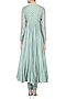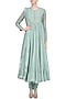 This set features a sage blue kalidaar kurta in chanderi base highlighted with boota applique on the bodice. It flares out into a neatly trimmed pleated skirt and has hook-eye closure detailing on the front placket. It is paired with sage blue silk churidaar pants and matching dupatta in chanderi base.