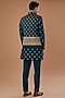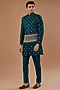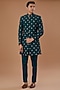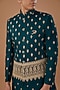 Featuring a blue nehru jacket in vichitra silk base with sequins and thread embroidery. It is paired with a kurta, pants and a bespoke brooch. Perfect for an engagement or wedding ceremony.