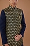 Featuring a green nehru jacket in faux georgette base with badla and thread embroidery. It is paired with a terry rayon shirt, pants and a bespoke brooch. Perfect for a wedding or engagement ceremony.