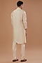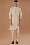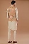 Featuring a haldi yellow nehru jacket in faux georgette base with sequins and thread embroidery. It is paired with a russian silk kurta, pants and a bespoke brooch. Perfect for a haldi or sangeet ceremony.