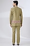 Featuring a mehendi green nehru jacket in terry rayon base with thread, moti and sequins hand embroidery. It is paired with indowestern, trousers and a bespoke brooch. Perfect wear for a mehendi or engagement ceremony.