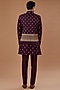 Featuring a wine nehru jacket in vichitra silk base with sequins and thread embroidery. It is paired with a kurta, pants and a bespoke brooch. Perfect for an engagement or wedding ceremony.