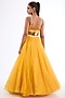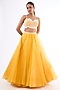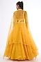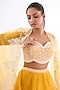 Featuring a mango yellow lehenga in organza base. It is paired with an embroidered blouse and a cape having white beaded embroidery. Accentuate with statement earrings and heels for a cocktail party, sangeet or engagement ceremony.