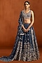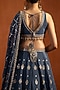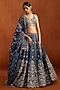 Featuring a blue lehenga in chiffon base with sequins, zari and thread embroidery. It is paired with an embroidered blouse and a tissue dupatta. Accentuate it with zircon or kundan jewellery, a sleek low bun and block heels for a complete ensemble, ideal for wedding, engagement or sangeet celebrations.
