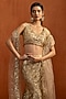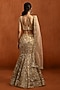 Featuring a golden fish-cut lehenga in net base with sequins, zari, beads and thread embroidery. It is paired with an embroidered blouse and a net dupatta. Accentuate it with zircon dangler earrings, a sleek low bun, and metallic heels for a dramatic ensemble, ideal for sangeet nights or cocktail celebrations.