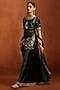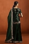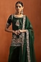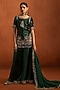 Featuring a green short kurta in velvet base with zari, sequins and thread embroidery. It is paired with sharara pants and an organza dupatta. Accentuate it with statement earrings, a sleek braid, and metallic heels, ideal for festive occasion, mehendi or sangeet ceremony.