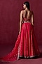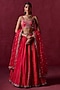Lashkaraa presents a hot pink lehenga in crepe silk base with zari, sequins and thread embroidery. It is paired with a blouse and a net dupatta. Accentuate it with statement earrings and heels for weddings or sangeet ceremonies.