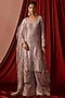 Featuring a lavender kurta in silk base with thread, sequins and zari embroidery. It is paired with pants and a satin dupatta. Accentuate it with statement earrings, a sleek braid and metallic heels, perfect for EID or festive occasions.
