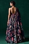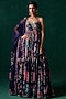 Lashkaraa presents a navy blue anarkali in chiffon base with floral print, including zari, sequins and mirror hand embellishments. It is paired with satin pants and a chiffon dupatta. Accentuate it with statement earrings and heels for any festive occasion.