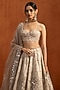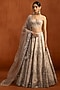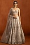 Featuring an off-white lehenga in silk satin base with thread, sequins, beads and mirror work. It is paired with an embroidered blouse and a net dupatta. Accentuate it with zircon or kundan jewellery, a sleek low bun and block heels for a complete ensemble, ideal for wedding, engagement or sangeet celebrations.