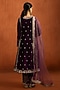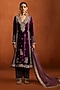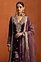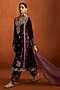 Featuring a purple kurta in velvet base with zari, sequins and thread embroidery. It is paired with pants and a net dupatta. Accentuate it with statement earrings, a sleek braid, and metallic heels, ideal for festive occasion, mehendi or sangeet ceremony.