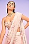 Featuring a soft pink pre-stitched saree in tabby silk base with thread and stone embroidery, including floral print. It is paired with a blouse. Style this designer saree with a pair of block heels and statement earrings for a sangeet or cocktail ceremony.