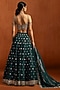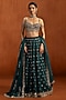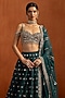 Featuring a teal lehenga in crepe base with zari, sequins and mirror work. It is paired with an embroidered blouse and an organza dupatta. Accentuate it with zircon or kundan jewellery, a sleek low bun and block heels for a complete ensemble, ideal for wedding, engagement or sangeet celebrations.