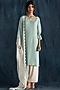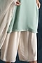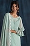 Featuring a mint green kurta in georgette base with gathered bell sleeves and gold embroidery. It is paired with contrasting ivory satin palazzo pants and an ombre dupatta having handmade scalloped trims.