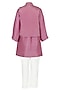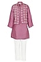 Featuring a mauve nehru jacket for boys in silk base with silver thread and beads embroidery. It is paired with a pink kurta and white trousers. Style it with mojaris and a watch for a wedding ceremony or festive occasion.