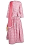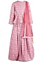 Featuring a pink lehenga in poly base with paisley embroidery. It is paired with a matching blouse and a dupatta.