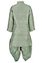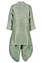 Featuring a sage green kurta for boys in silk blend base with embroidery. It is paired with dhoti pants. Style it with mojaris and a watch for mehendi ceremony or festive occasion.