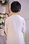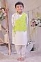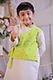 Featuring a green and white side-cut kurta for boys in roman silk base with a chinese collar and bandhej work. It is paired with cotton silk churidar pants. Style it with juttis and a watch for a festive occasion or pooja ceremony