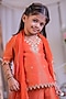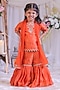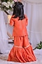 Featuring an orange blouse for girls in shimmer silk base with a round neckline. It is paired with sharara pants and a net dupatta. Accentuate it with matching hair clips and soft sandals for a stylish ensemble, ideal for pooja ceremonies or festive gatherings.