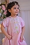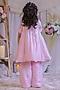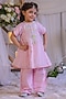 Featuring a pink kurta for girls in roman silk base with a round neckline and sequins work. It is paired with pants. Accentuate it with matching hair clips and soft sandals for a stylish ensemble, ideal for pooja ceremonies or festive gatherings.