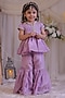 Featuring a purple kurta for girls in shimmer silk base with a round neckline. It is paired with sharara pants. Accentuate it with matching hair clips and soft sandals for a stylish ensemble, ideal for wedding ceremonies or festive gatherings.