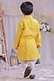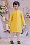 Featuring a yellow kurta for boys in chanderi silk base with a chinese collar. It is paired with cotton silk churidar pants. Style it with juttis and a watch for a haldi function or pooja ceremony